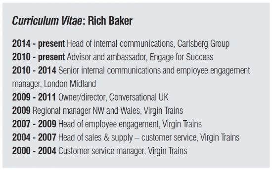 He wasn’t unemployed for long. Within two weeks of leaving London Midland, Baker had a number of offers. He then took on the role of head of internal communications at Carlsberg UK, where he has been for the past year. It’s a role he’s clearly enjoying. Carlsberg is the world’s fourth-largest brewer, with 2,000 staff across its 14 sites. As well as running the internal communications, Baker sits on the senior management team.