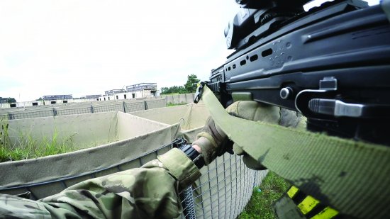 The Warrior Fighting Vehicle comes careening down the hill and screams to a stop. Infantrymen pour out the back and approach, under smoke and flashbangs, an enemy compound. The director calls out and the soldiers stop their assault, regrouping to the tracked, armoured, 25-tonne vehicle. Helmets come off and groups of soldiers form, lolling on the knoll while the director reviews footage with a young lieutenant. Cameras pause and scenes reset on the training ranges outside Paderborn, Germany.