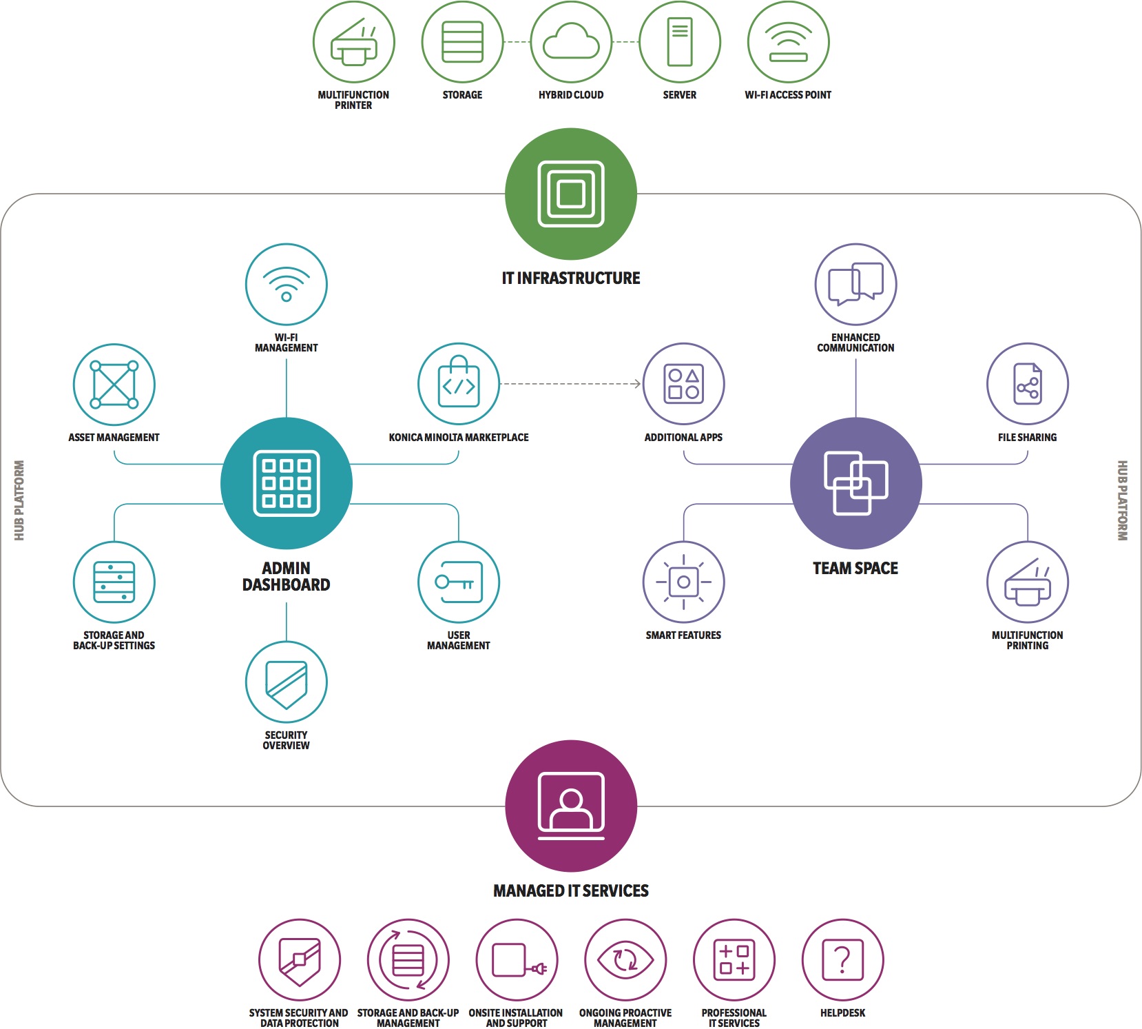 Workplace Hub is defined by four areas. One, implemented in aqua, is the administration dashboard. The icons here represent the basic IT management capabilities any IT system should have. Second, the purple ‘Team Space’ offers the collaborative functionality that will set the tone for Konica Minolta’s vision of the future of work. Third, is managed IT services, in magenta, where bespoke icons allow users to put the new technology to work in increasing business efficiencies through IT. Finally, the infrastructure, in green, encompasses the capabilities that actually do make better use of the printer.
