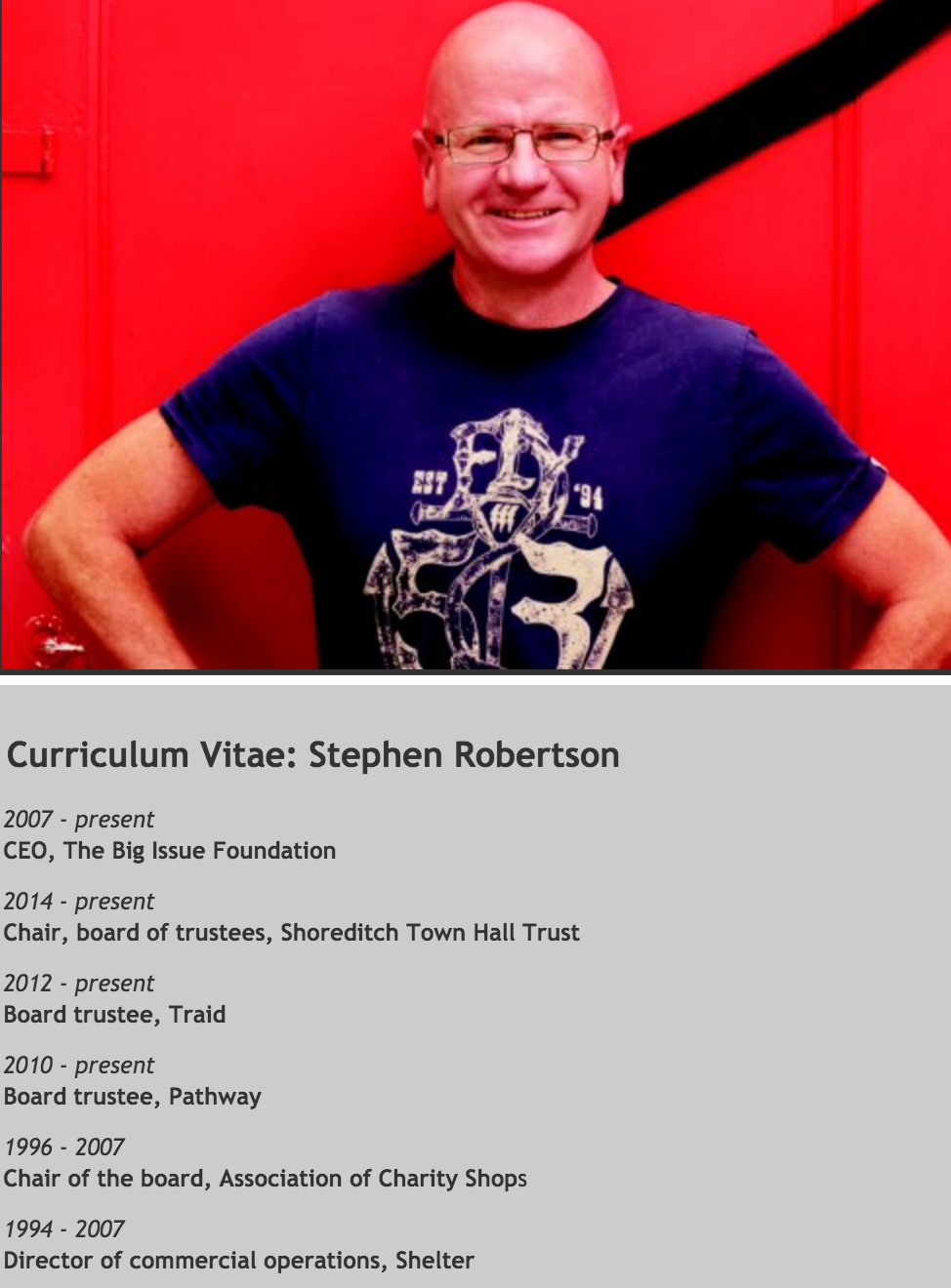 Robertson was at Marie Curie Cancer Care for a year before moving to a similar role at Shelter. This was a national role and started at a time when homelessness had been aggressively rising during the late 1980s and early 1990s. It was a high profile role. If there is an order of status in the charity sector, Robertson was definitely working for the equivalent of a blue chip firm. He was there for 13 years and had just started to think about what next to do with his career when he was approached by the Big Issue Foundation. “It was perfect timing,” he says. “I wanted to get closer to the work that charities fund. To continue funding, but also get some experience on the front line. Contrary to popular perception, the Big Issue Foundation isn’t that big. It gets noticed because of the visibility of the vendors, yet within the business the number of people who produce and take the magazine to market is less than 75 people and the charity that takes the business journey forward, the part where I am most involved, is less than 35 people.” Last year, the Big Issue Foundation helped over 6,000 people, including 2,000 vendors, with a headcount of only 100 people. As Robertson adds, “You don’t really get any more front line than that.”