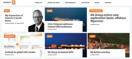 Gas exploration and extraction giant BG Group has revamped its corporate site, bg-group.com, with a content-led approach. People visit the BG Group website for a variety of reasons – they might be geologists or engineers investigating employment opportunities at the company, politicians interested in finding out more about the activities of one of the world’s biggest suppliers of liquefied natural gas or investors checking out the company’s financial results. To cater for all these audiences, the bg-group.com website, created by Addison Group, has integrated a system of “fluid” content so the most important content appears on the landing page. In line with standard corporate websites, there are links to pages for investors, media and recruitment, but most of the updated posts are not confined to one specific area of the website. Instead, a filtering system allows users to click through to the content they want.