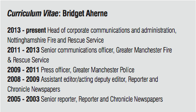 In autumn 2013, Aherne added another discipline to her skill-set. Moving to Nottingham (a big step for the self-titled ‘terminal Manc’) to join the Nottinghamshire Fire and Rescue Service, she took up her current role of head of corporate communications and administration. It’s an interesting role, incorporating the management of the call centre function. Aherne doesn’t see any discrepancy in the role. “Put simply, face-to-face contact is with firefighters, and everything else, all non-face-to-face contact, comes to my team. Administration is public-sector speak for customer service. So actually it’s a good fit with corporate communications because the same values need to come through.”
