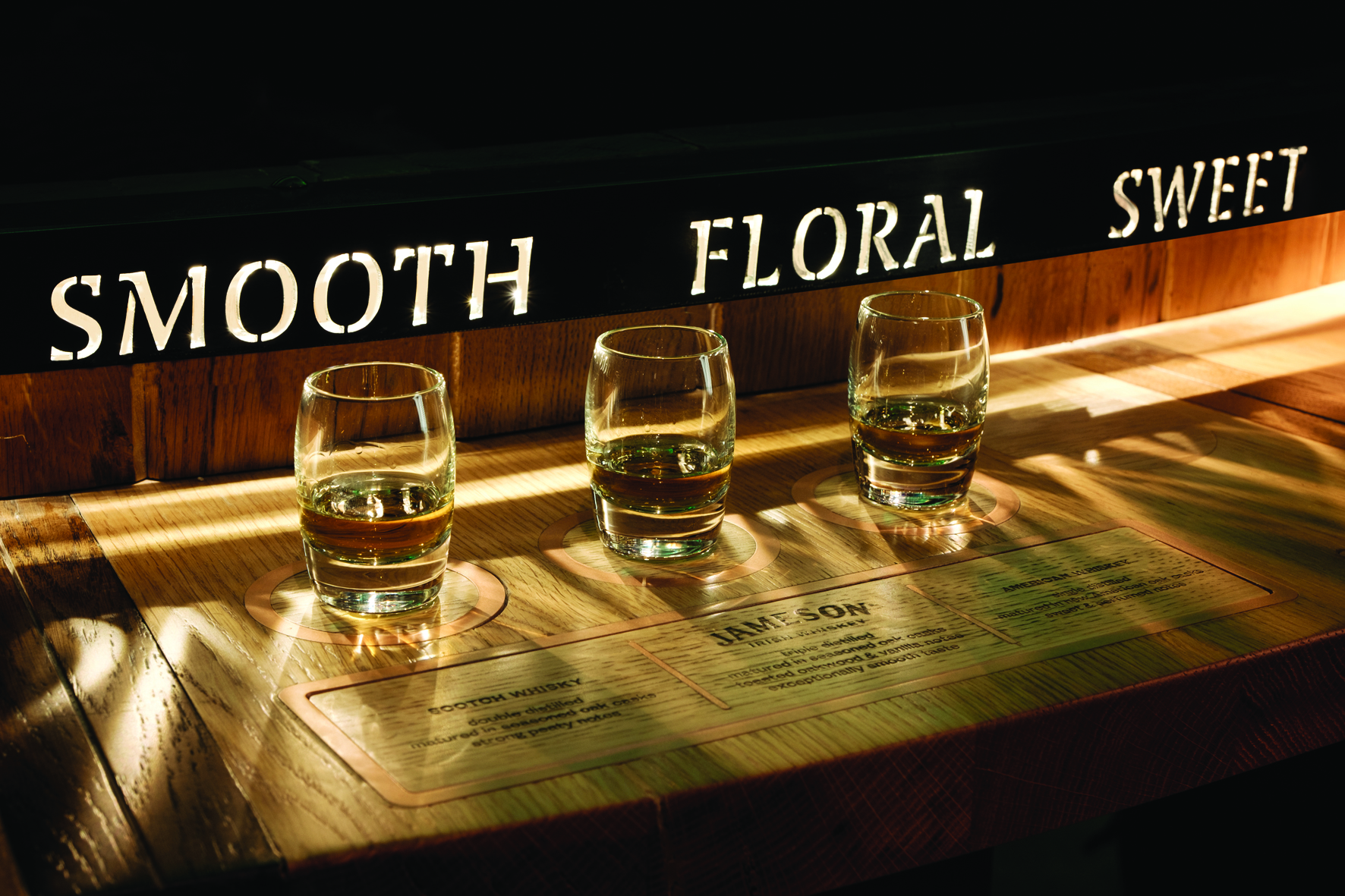 The time lapse introduction to the new experience documents a historic change to the site and builds on the value Jameson places on its craft and those who work to bring the brand to life. He or she then leads the group into the next room, a renovated feast of Irish oak and low lighting that complement a hands-on experience detailing the distilling process. But, it’s all complemented by a 3D map projection that enhances the storytelling and the visual experience.